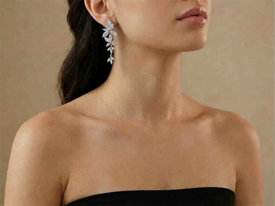 העגילים עוצבו בהשראת עולם הטבע, עם מוטיב עלים עדין הזורם לאורך הצוואר ומעניק לו מראה ארוך ואצילי.