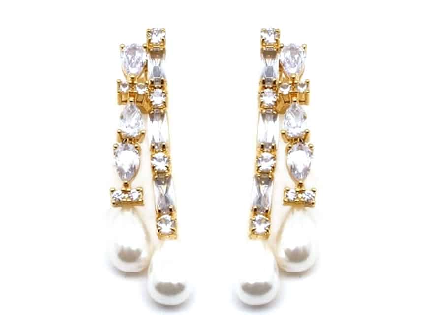 עגילי טיפות פנינה וקריסטל אלגנטיים. שני קווים מקבילים של אבני קריסטל מלבניות ומרקיזה,